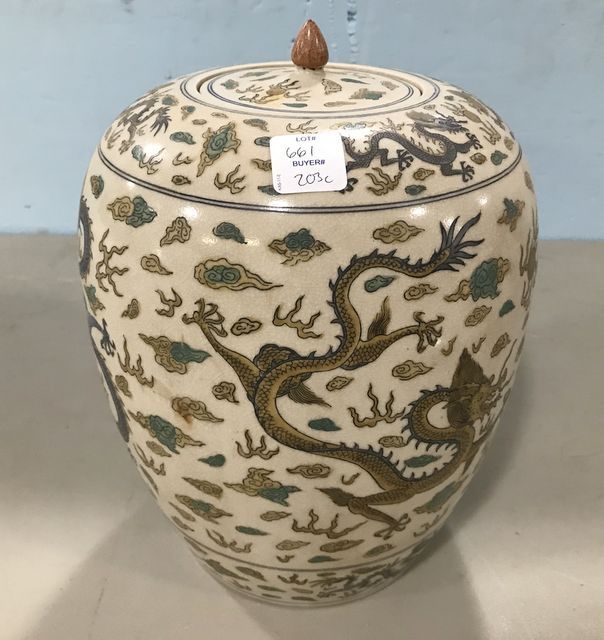 Signed Satsuma Style Urn with Dragons, with lid, 9"h. Signed Satsuma Style Urn with Dragons, with lid, 9"h.
