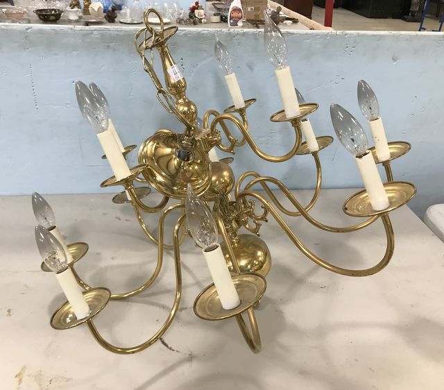 Brass Colonial Style Chandelier, 12 arm light fixture, working condition. Brass Colonial Style Chandelier, 12 arm light fixture, working condition.