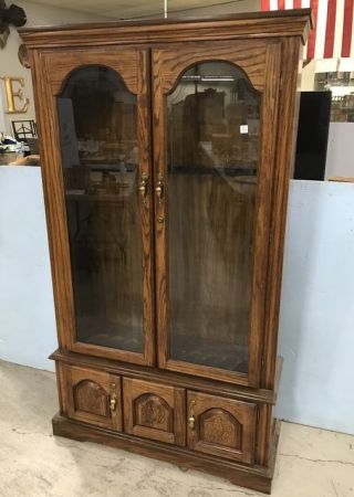 Vintage Oak Double Door Gun Cabinet, no key, 10 gun slots, bottom drawers, 72"h., 40"w., 11"d. Vintage Oak Double Door Gun Cabinet, no key, 10 gun slots, bottom drawers, 72"h., 40"w., 11"d.