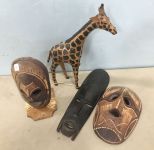 African Tribal Carved Masks and Giraffe Statue 17"h. African Tribal Carved Masks and Giraffe Statue 17"h.