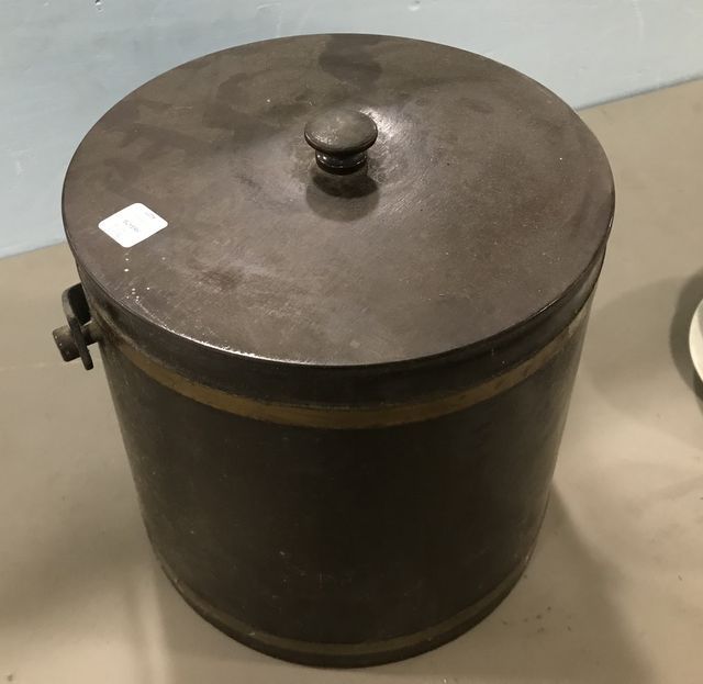 Primitive Style Wood Syrup Bucket, handled, and lid, 12"h., 11"dia. Primitive Style Wood Syrup Bucket, handled, and lid, 12"h., 11"dia.