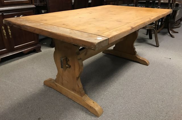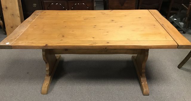 Farm Style Double Pedestal Dining Table, pull out side extension leaves, has finish wear, solid piece, 70"l., 40"w., 30"h. Farm Style Double Pedestal Dining Table, pull out side extension leaves, has finish wear, solid piece, 70"l., 40"w., 30"h.
