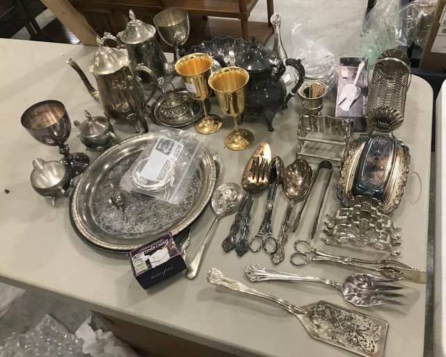 Group of Silver Plate Serving Pieces, brass goblets, butter dish, scoop, tongs, serving plates, pitchers, dishes. Group of Silver Plate Serving Pieces, brass goblets, butter dish, scoop, tongs, serving plates, pitchers, dishes.
