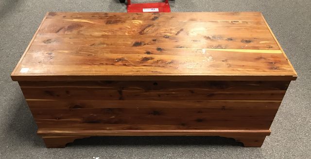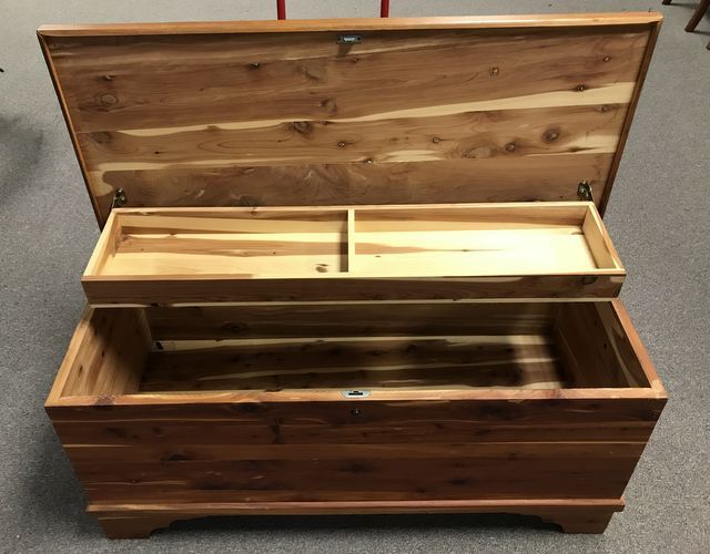 Push Button Cedar Storage Chest, with inner tray, light wear, 19"h., 41"w., 18"d. Push Button Cedar Storage Chest, with inner tray, light wear, 19"h., 41"w., 18"d.