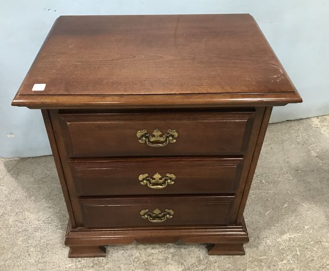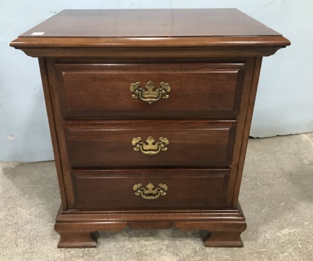 Cherry Early American Style Night Stand, three drawers, has wear on top, 26"h., 24"w., 16"d. Cherry Early American Style Night Stand, three drawers, has wear on top, 26"h., 24"w., 16"d.