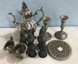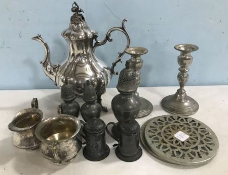 Plated Acorn Tea pot, pair of pewter candle sticks, sugar, creamer, Stieff pewter salt & peppers, silver plate hot plates. Plated Acorn Tea pot, pair of pewter candle sticks, sugar, creamer, Stieff pewter salt & peppers, silver plate hot plates.