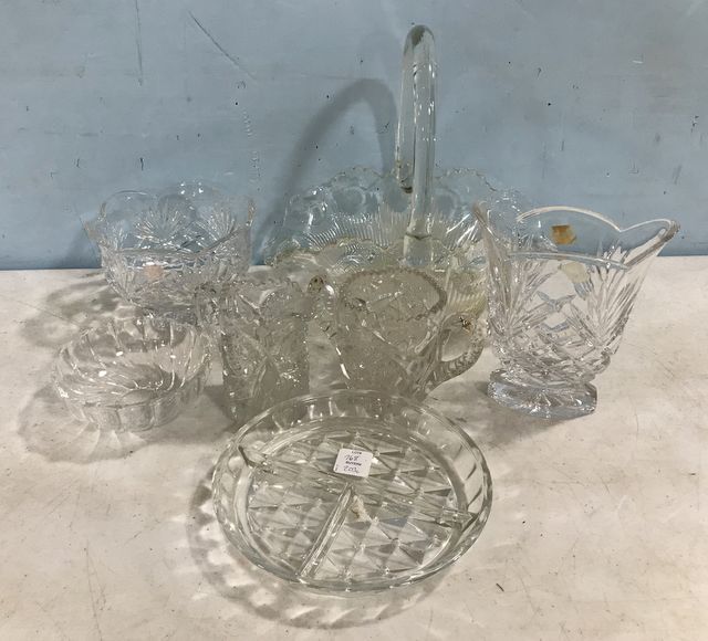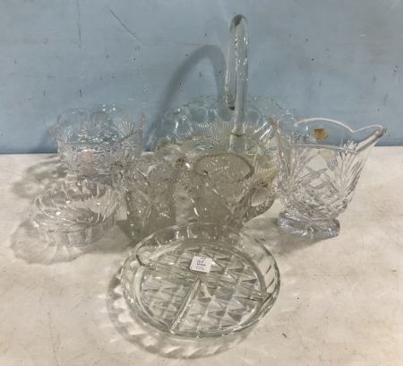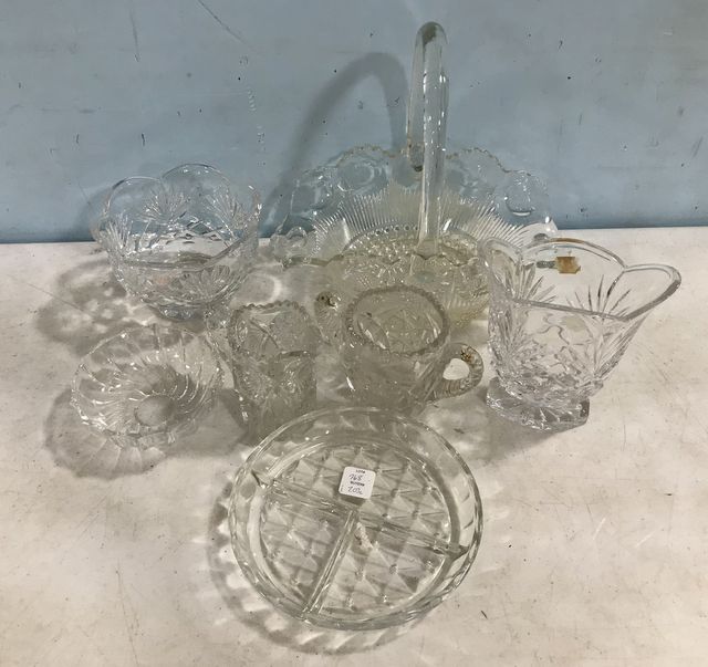 US GLass "Manhattan" basket, Pressed glass cream & sugar, divided dish, bowls. US GLass "Manhattan" basket, Pressed glass cream & sugar, divided dish, bowls.