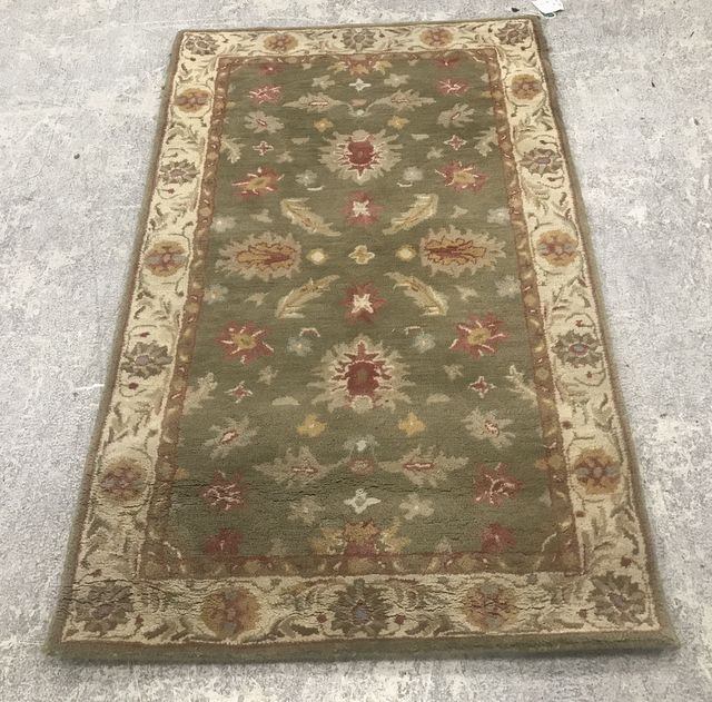 2' x 6' Olive and Cream Thicker Wool Area Rug , needs some cleaning. Rug will look lighter in Photograph. 2' x 6' Olive and Cream Thicker Wool Area Rug , needs some cleaning. Rug will look lighter in Photograph.