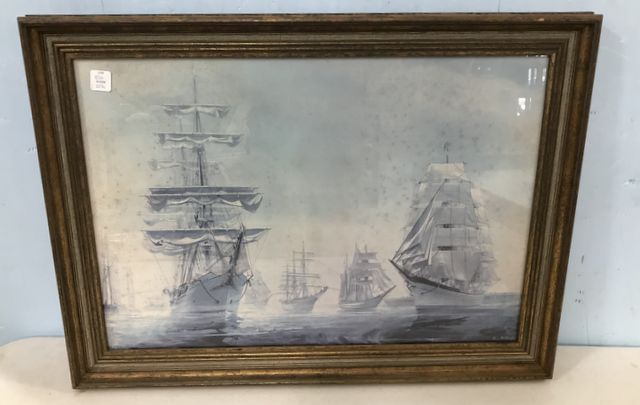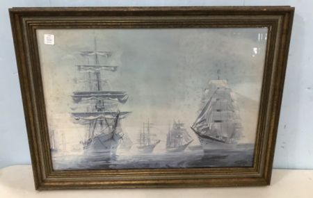Framed Ship Print by Soldwedel, framed, has moisture spots, 20"h., 27"w. Framed Ship Print by Soldwedel, framed, has moisture spots, 20"h., 27"w.