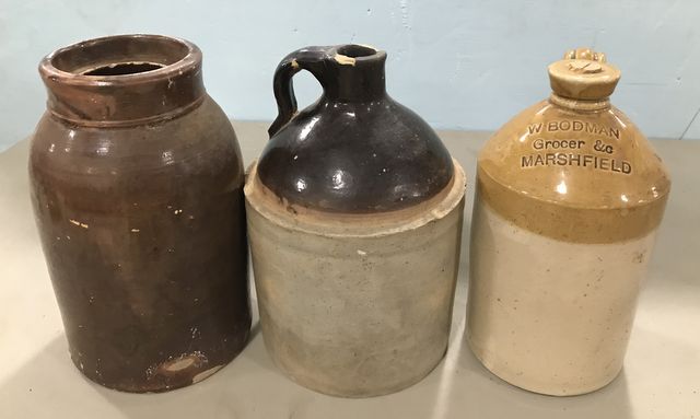 Three Pottery Whiskey Jugs, English pottery whiskey jug, 11"h., Brown medium crock jar, Gallon Crock jug. Three Pottery Whiskey Jugs, English pottery whiskey jug, 11"h., Brown medium crock jar, Gallon Crock jug.