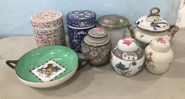 Noritake bowl, Orange White cylindrical lidded jar, Chrysanthemum cylinrical blue and white lidder jar, ginger jars, milk glass humidor, Fenton Ironstone. Noritake bowl, Orange White cylindrical lidded jar, Chrysanthemum cylinrical blue and white lidder jar, ginger jars, milk glass humidor, Fenton Ironstone.
