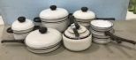 Group of Vintage Asta Enamel Pots and Pans, cooking pans, sauce pans, assorted sized, some used more then others. Group of Vintage Asta Enamel Pots and Pans, cooking pans, sauce pans, assorted sized, some used more then others.