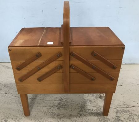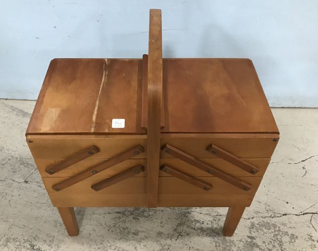 Fold Out sewing basket, used condition, 23"h., 20"w. Fold Out sewing basket, used condition, 23"h., 20"w.