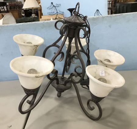 Modern Five Arm Chandelier, metal gray frame, white glass shades, 24"h., 27"w. Modern Five Arm Chandelier, metal gray frame, white glass shades, 24"h., 27"w.