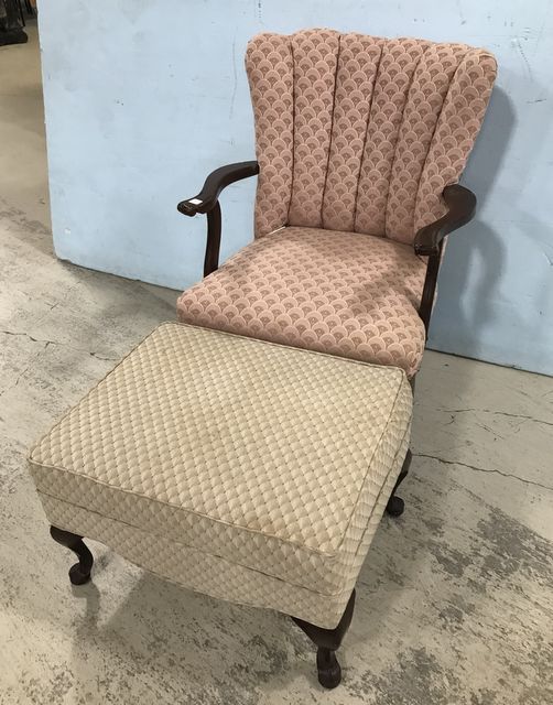 Queen Anne Style Arm Chair and Ottoman, mahogany frame, has scratches and wear, tufted back, needs cleaning, ottoman fabric doesn't match. Queen Anne Style Arm Chair and Ottoman, mahogany frame, has scratches and wear, tufted back, needs cleaning, ottoman fabric doesn't match.