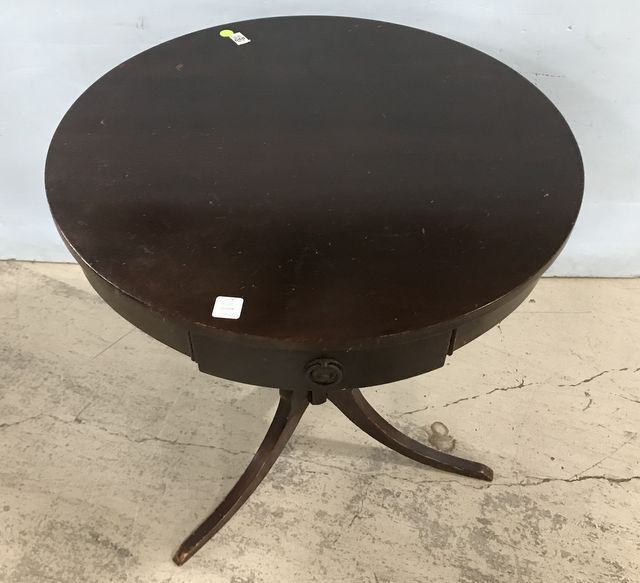 Vintage mahogany drum table, pedestal base, single drawer, has wear, 26"h., 24"w. Vintage mahogany drum table, pedestal base, single drawer, has wear, 26"h., 24"w.