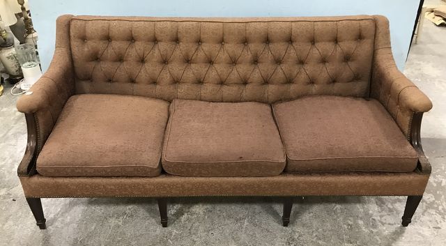 Henredon Mid Century Tufted 3 Cushion Sofa, mahogany, average condition, 6'5. Henredon Mid Century Tufted 3 Cushion Sofa, mahogany, average condition, 6'5.