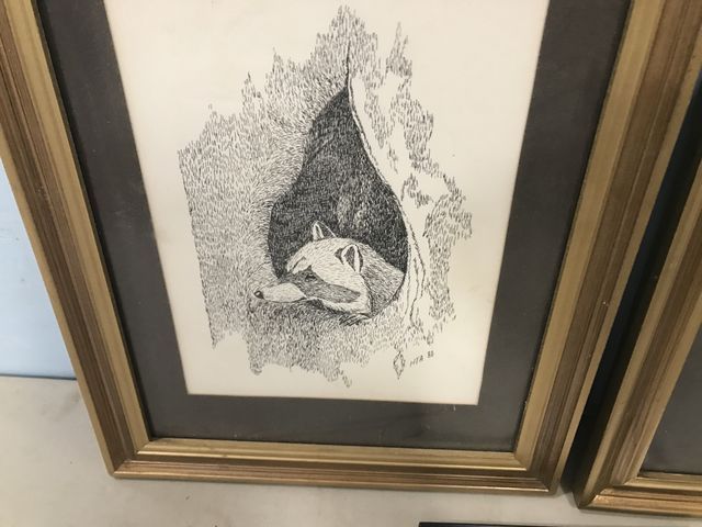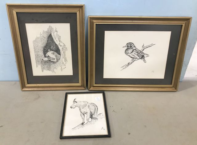 Three Animals Drawing by HTA, framed, ducks, raccoon, mountain goat, largest is 14"w., 13"h. Three Animals Drawing by HTA, framed, ducks, raccoon, mountain goat, largest is 14"w., 13"h.