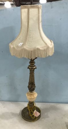 Modern French Style Antiqued Lamp, faux marble insert, painted factory, with shade, 36"h. Modern French Style Antiqued Lamp, faux marble insert, painted factory, with shade, 36"h.