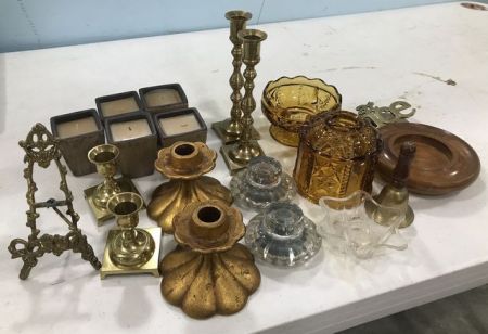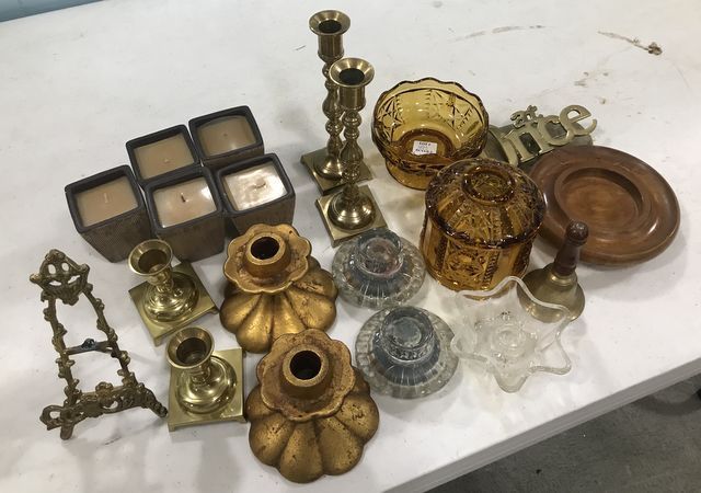 Brass candle holders, gold gilt holders, modern pottery candles, mini brass easel, amber pressed glassware, at once brass, bell, glass holders. Brass candle holders, gold gilt holders, modern pottery candles, mini brass easel, amber pressed glassware, at once brass, bell, glass holders.
