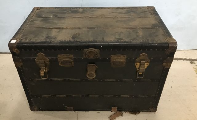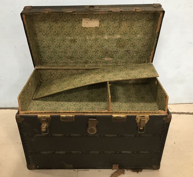 Black and Green Flat Travel Trunk, paper lined, has inner tray, condition is worn, 22"h., 44"w., 19"d. Black and Green Flat Travel Trunk, paper lined, has inner tray, condition is worn, 22"h., 44"w., 19"d.