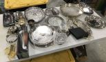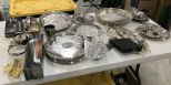 Large Group of Silver Plate Serving Pieces, serving tray, ladle, ashtray, footed tray, napkins rings, cheese dish, gravy, butter dish, handled tray, hot plate stands. Large Group of Silver Plate Serving Pieces, serving tray, ladle, ashtray, footed tray, napkins rings, cheese dish, gravy, butter dish, handled tray, hot plate stands.