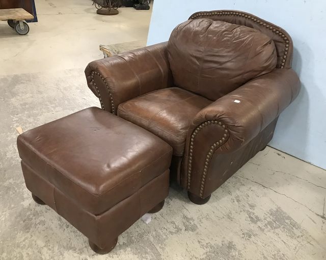 Large Brown Vinyl Leather Chair and Ottoman , removable feet, needs cleaning. Large Brown Vinyl Leather Chair and Ottoman , removable feet, needs cleaning.