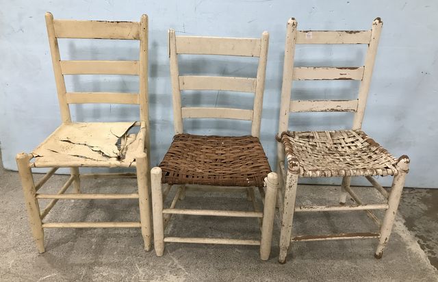 Three Antique Painted Oak Porch Chairs, oak, two woven seats, one leather, each have seat damage, 34"h. Three Antique Painted Oak Porch Chairs, oak, two woven seats, one leather, each have seat damage, 34"h.
