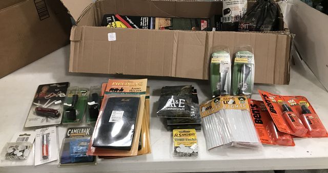 Collection of Outdoor Accessories, Dale Jr Knife, Trail tacks, camo wallets, ammo holders, limb lights, speed wrench, clay target throwers, Ben's insect repellent, bug pack suits. Collection of Outdoor Accessories, Dale Jr Knife, Trail tacks, camo wallets, ammo holders, limb lights, speed wrench, clay target throwers, Ben's insect repellent, bug pack suits.
