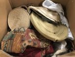 Box of Linens and Upholstery Pieces, straps, linens, clothes. Box of Linens and Upholstery Pieces, straps, linens, clothes.