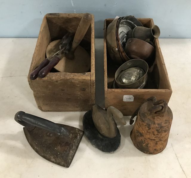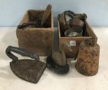 1208 Primitive Molds, Boxes, Iron, Cotton Scale Weight, and Brass Swan