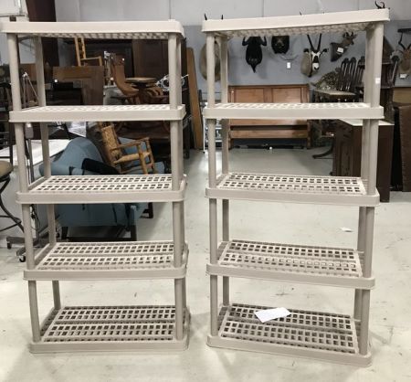 Two Plastic Storage Shelves, will disassemble, 75"h., 34"w. Two Plastic Storage Shelves, will disassemble, 75"h., 34"w.