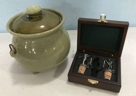 Ceramic Hand Made Pot and Golf Wine Corks in box. Ceramic Hand Made Pot and Golf Wine Corks in box.