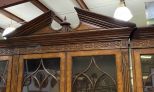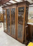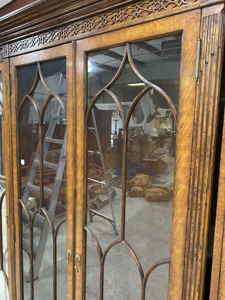 Large Three Three Section Display Cabinet, Center and two sides, lighted, glass, wood and glass shelves, Antique Reproduction, good condition, 85"h., 82"w., 15"d. Large Three Three Section Display Cabinet, Center and two sides, lighted, glass, wood and glass shelves, Antique Reproduction, good condition, 85"h., 82"w., 15"d.
