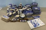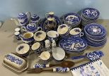 Large Group of Japan Blue Willow China, butter dish, pitcher, creamer, sugar, jars, dishes, bowls, saucers, cups, salad set, pie server, several have chips. Large Group of Japan Blue Willow China, butter dish, pitcher, creamer, sugar, jars, dishes, bowls, saucers, cups, salad set, pie server, several have chips.