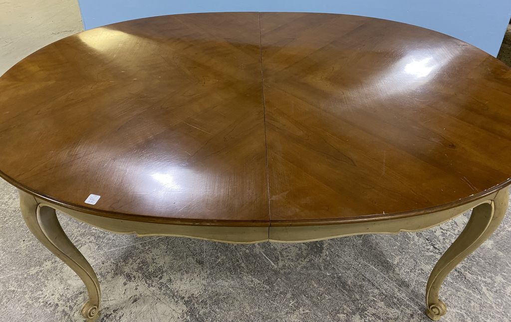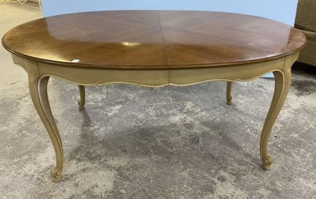 R. Walter & Co. French Style Dining Table, natural top, painted base, pads, three leaves, good condition, 29"h., 66"w., 44"d. R. Walter & Co. French Style Dining Table, natural top, painted base, pads, three leaves, good condition, 29"h., 66"w., 44"d.