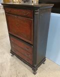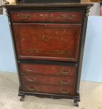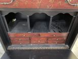 Modern Oriental Style Red Secretary, one piece, drop front desk, interior shelves, three drawers, black factory painted, 56"h., 38"w., 18"d. Modern Oriental Style Red Secretary, one piece, drop front desk, interior shelves, three drawers, black factory painted, 56"h., 38"w., 18"d.