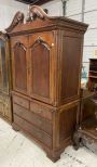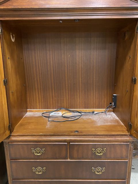 Antique Reproduction Cherry Entertainment Armoire, two pieces, double door, four drawers, light wear, 88"h., 47"w., 24"d, one door clamp needs work. Antique Reproduction Cherry Entertainment Armoire, two pieces, double door, four drawers, light wear, 88"h., 47"w., 24"d, one door clamp needs work.