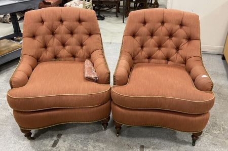 Pair of Red Sherrill Upholstered Arm Chairs, button tufted, tacked, on casters, 35"h., 30"w. clean. Pair of Red Sherrill Upholstered Arm Chairs, button tufted, tacked, on casters, 35"h., 30"w. clean.