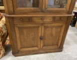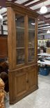 Large Oak Antique Corner Cabinet, two piece, top with glass doors, two wood shelves, base with three drawers, double door storage, has age wear, 109"h., 54"w., 29"d. Large Oak Antique Corner Cabinet, two piece, top with glass doors, two wood shelves, base with three drawers, double door storage, has age wear, 109"h., 54"w., 29"d.