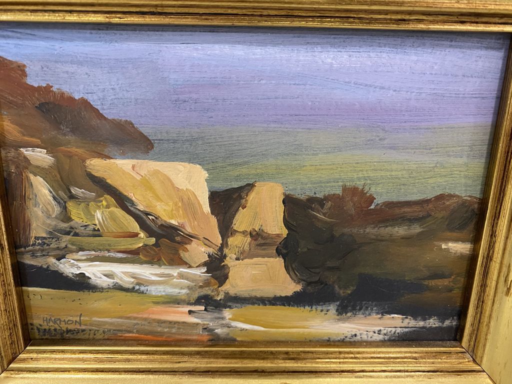 Harmon Signed Landscape Painting, on board, gold gilt, framed, 9"h., 11"w. Harmon Signed Landscape Painting, on board, gold gilt, framed, 9"h., 11"w.