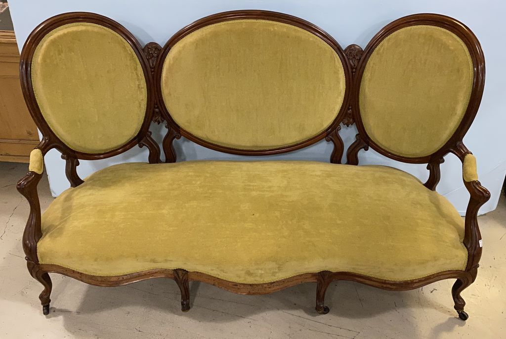 Antique Victorian Settee, Mahogany, missing a casters, fabric has wear, 70". Antique Victorian Settee, Mahogany, missing a casters, fabric has wear, 70".