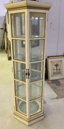 White Octogen Display Cabinet, double door, beveled glass, four glass shelves, lighted, painted, 72"h., 24"w. White Octogen Display Cabinet, double door, beveled glass, four glass shelves, lighted, painted, 72"h., 24"w.