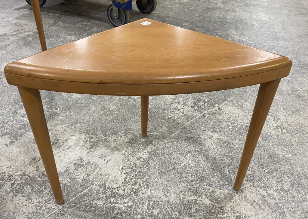 Heywood Wakefield Triangle Side Table, Mid Century, Maple, good condition, 19"h., 27"w. Heywood Wakefield Triangle Side Table, Mid Century, Maple, good condition, 19"h., 27"w.