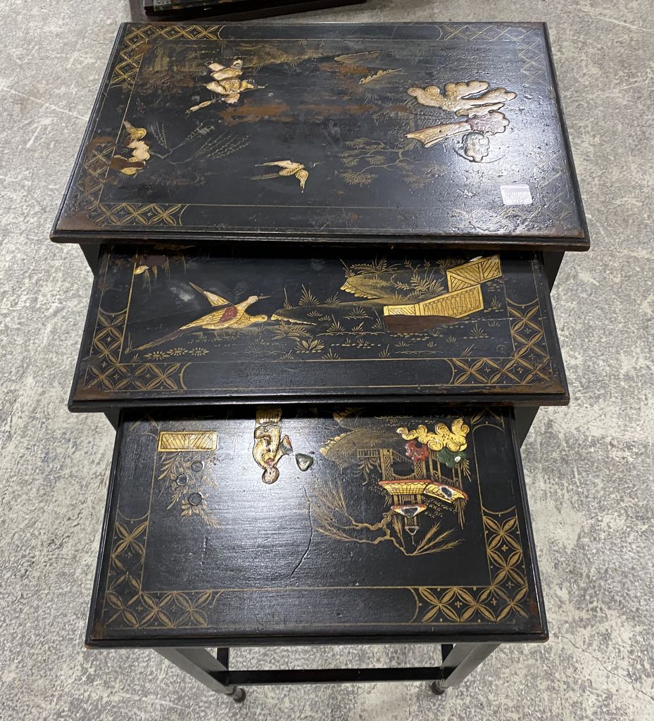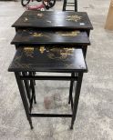 Chinese Painted Nesting Tables, three assorted sized, embossed design, black, 25"h., 19"w. Chinese Painted Nesting Tables, three assorted sized, embossed design, black, 25"h., 19"w.