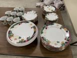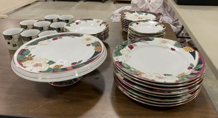 Tienshan Fine China "Magnolia" Set, 8 dinner plates, cake stand, 8 bowls, 8 dessert plates, 8 salad plates, 8 cups. Tienshan Fine China "Magnolia" Set, 8 dinner plates, cake stand, 8 bowls, 8 dessert plates, 8 salad plates, 8 cups.