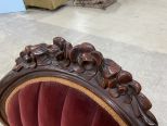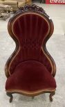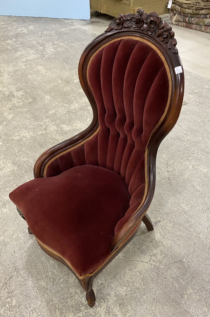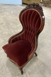 Ladies French Style Parlor Style Chair, red velvet fabric, rose carved crest, good condition. Ladies French Style Parlor Style Chair, red velvet fabric, rose carved crest, good condition.