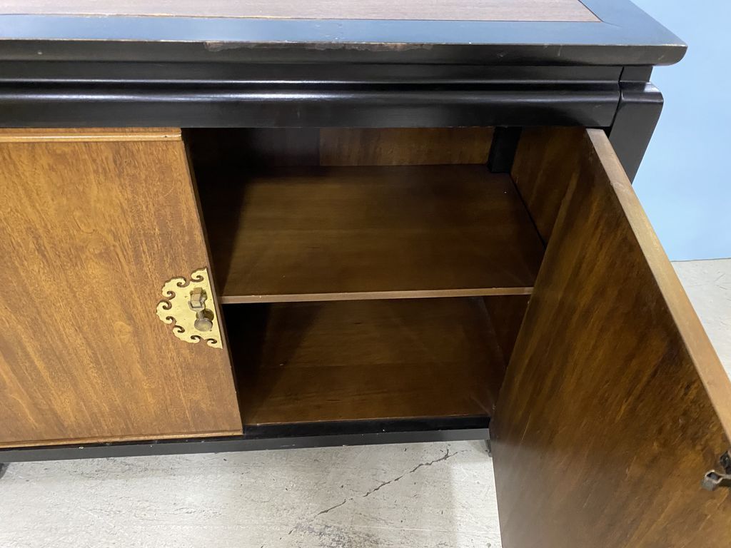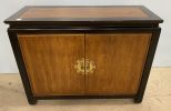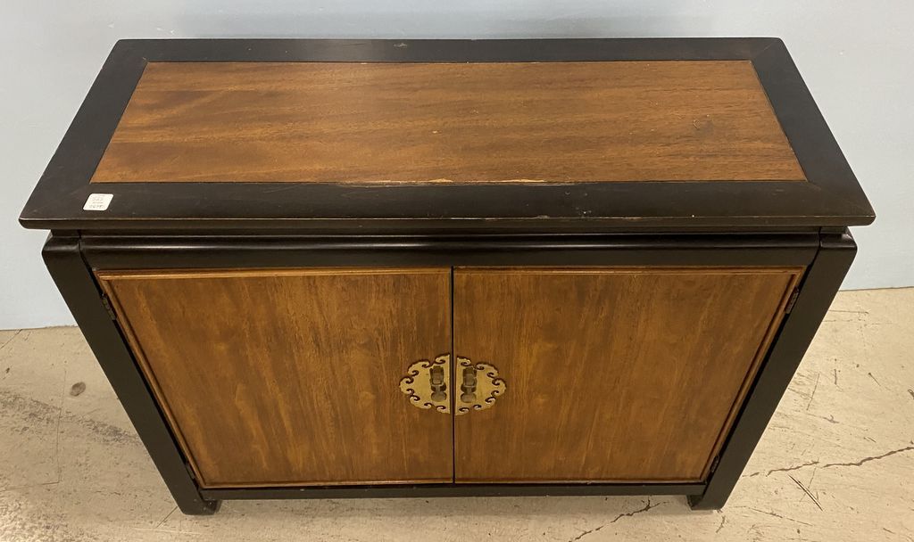 Oriental Style Commode, black painted, double door, light finish wear, 28"h., 46"w., 18"d. Oriental Style Commode, black painted, double door, light finish wear, 28"h., 46"w., 18"d.