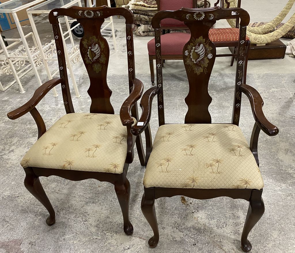 Modern Pair of Queen Anne Style Arm Chairs, floral painted designs, has some scratches. Modern Pair of Queen Anne Style Arm Chairs, floral painted designs, has some scratches.