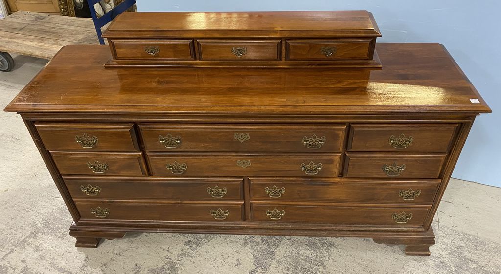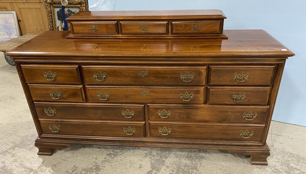 Early American Style Dresser, cherry, late 20th century, included matching mirror, needs work, and cleaning, 32"h., 65"w., 19"d. Early American Style Dresser, cherry, late 20th century, included matching mirror, needs work, and cleaning, 32"h., 65"w., 19"d.